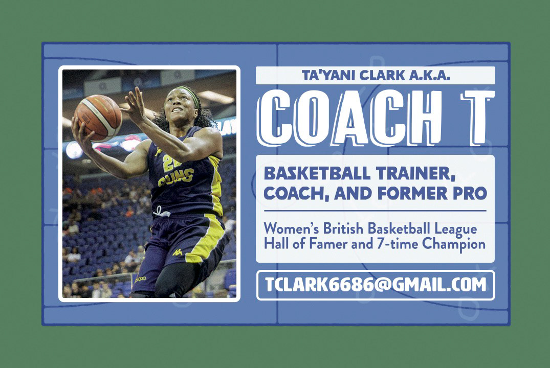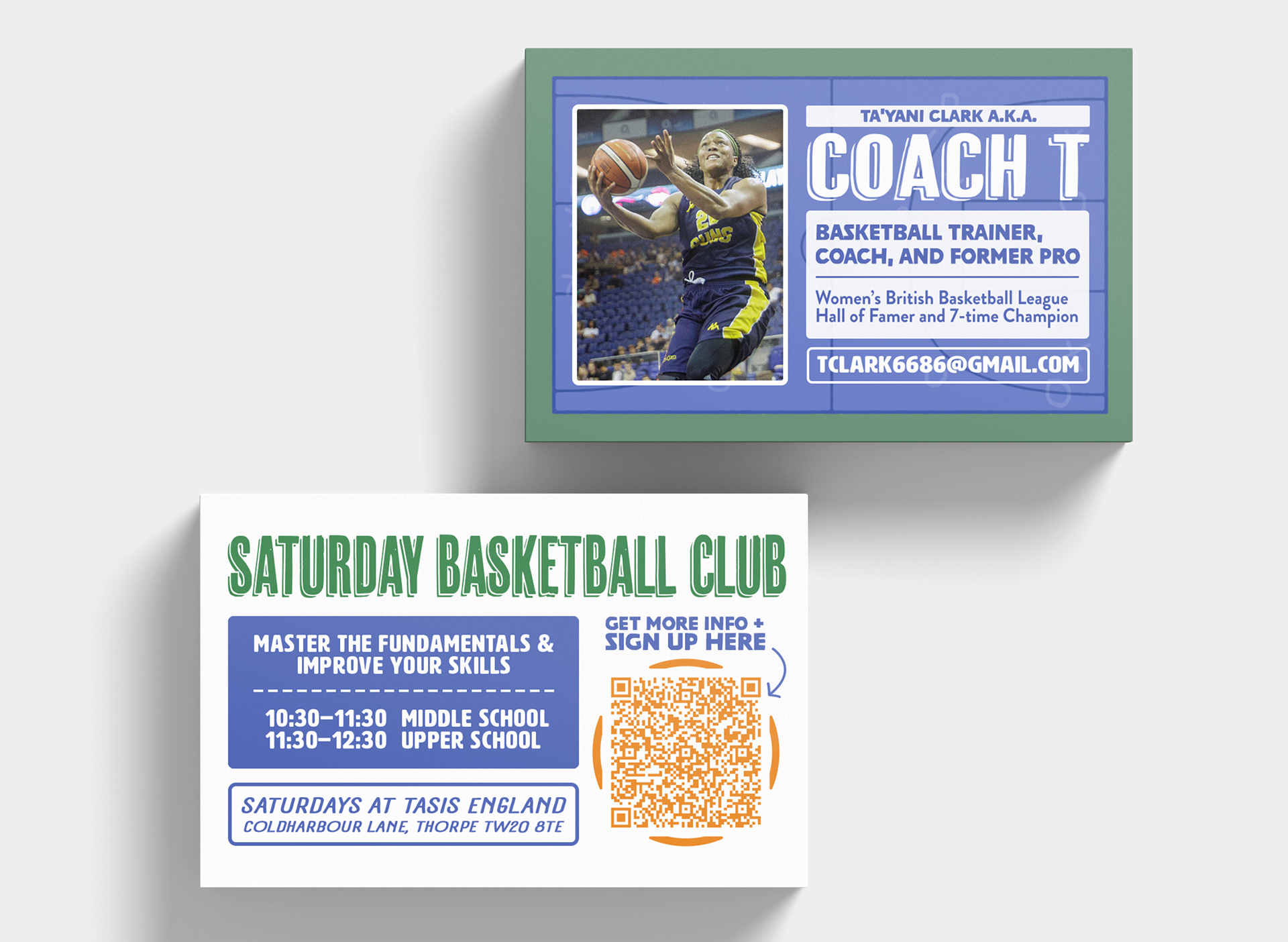 Business cards advertising Coach T's Saturday Basketball Club sessions, and highlighting her impressive qualifications. The email on the front and the QR code on the back are placed to encourage people to reach out and sign up.